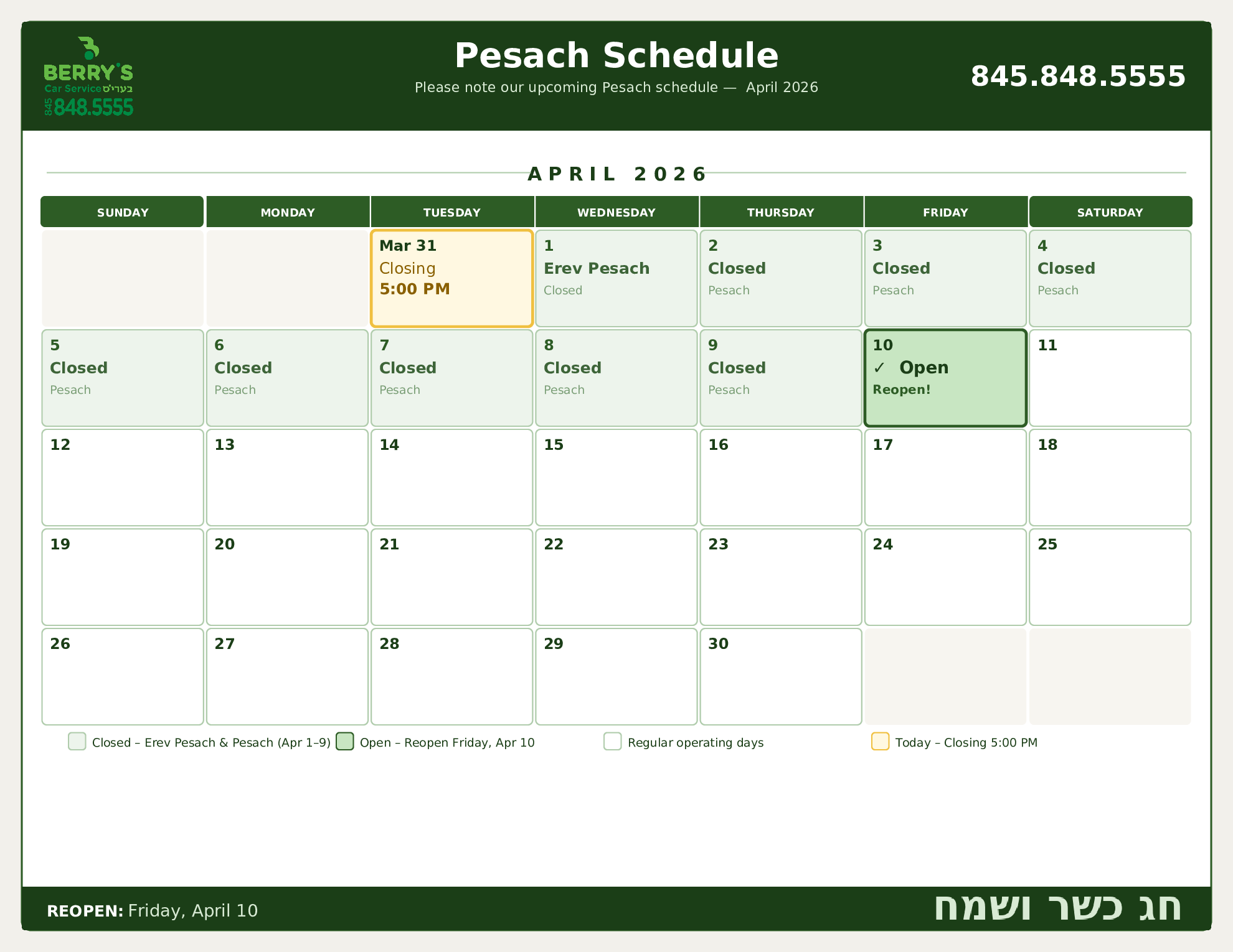 At Berry's, we go the extra mile—literally and figuratively. Whether you're commuting to work, heading to the airport, or requiring a luxury ride for a special occasion, our team of experienced Yiddishe drivers ensures every trip is smooth, safe, and comfortable.